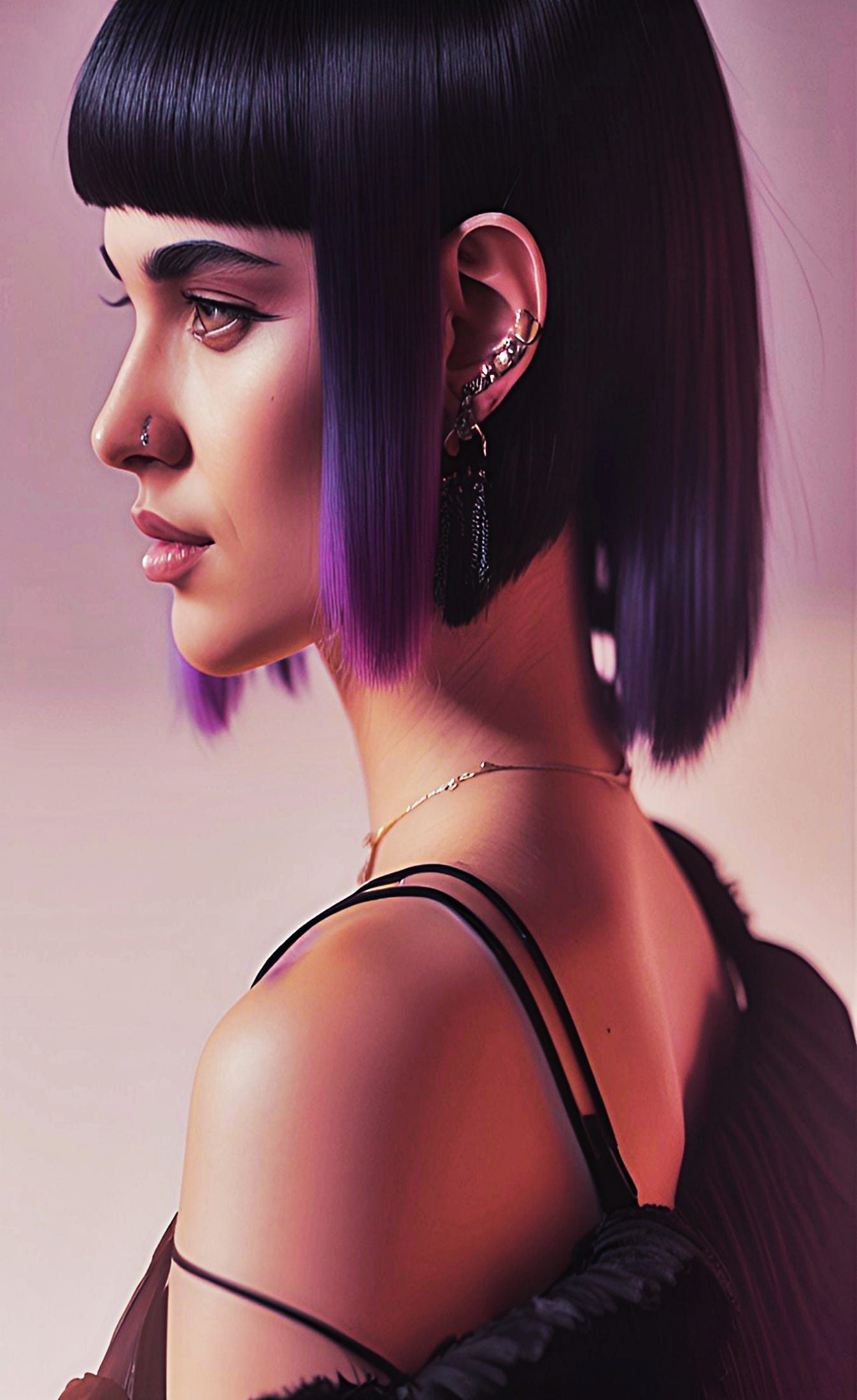 Mall is quite beautiful. She knows she is, too—and stylish. Her hair is shaved underneath, short-ish on top, with a tight, straight bangline. She often has a little splash or dab of color in it somewhere. Her makeup is typically subdued but distinctive. Her eyebrows are always perfect. Sometimes she wears a nosering.